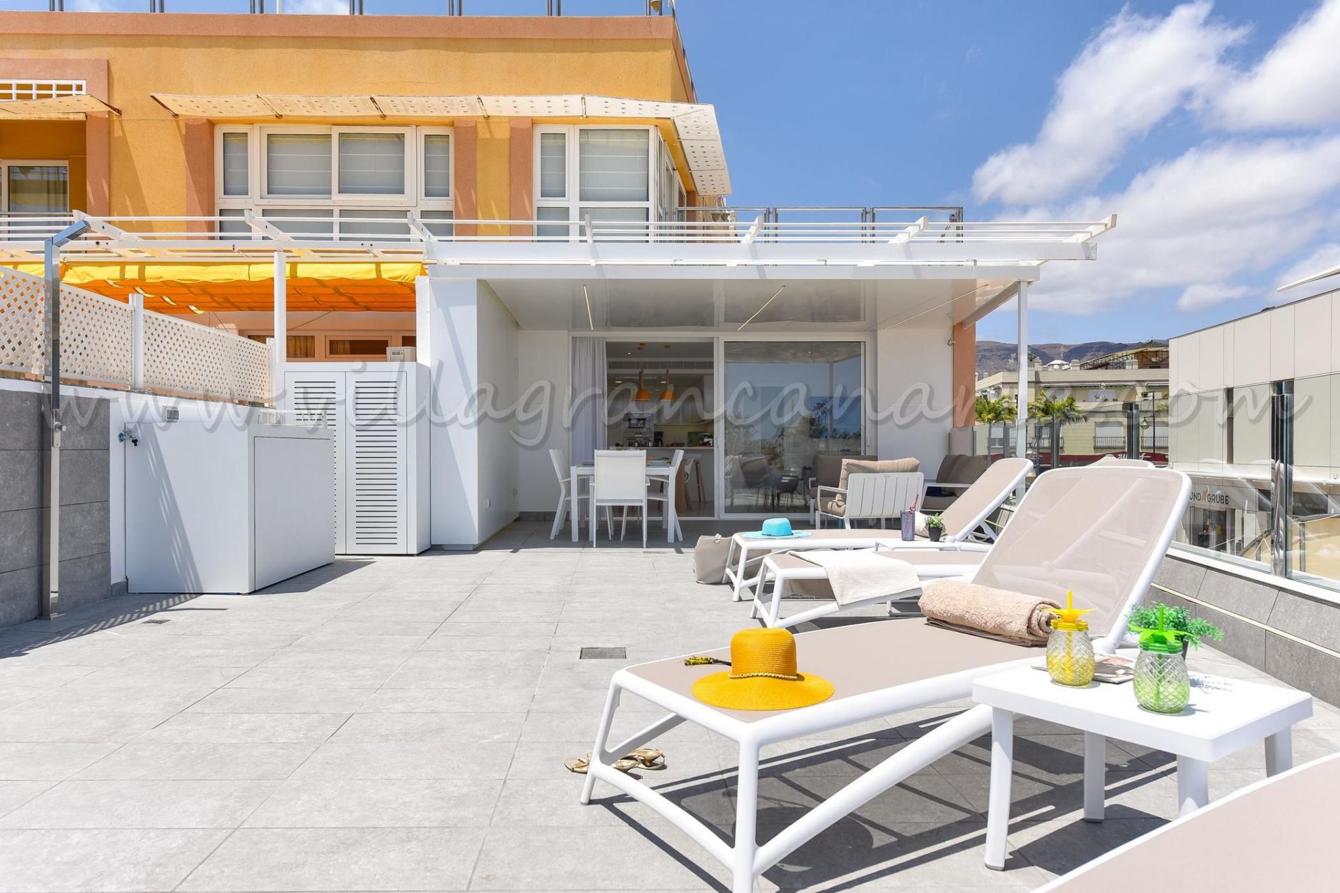 En la terra podrá encontrar tumbonas y es muy amplia (unos 80 metros cuadrados) con unas vistas fantásticas y privilegiadas del entorno, en especial de la playa y el Puerto de Mogán.