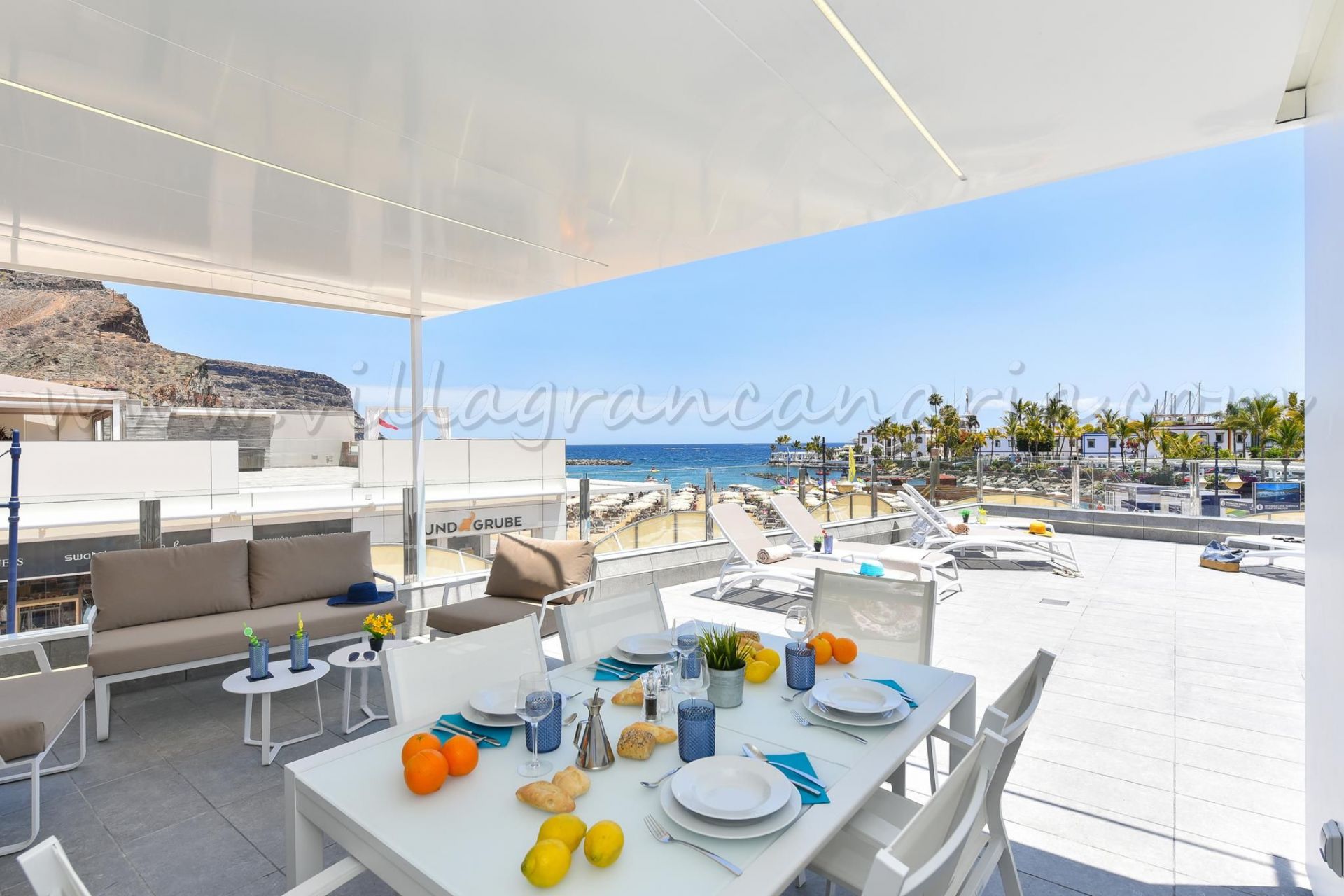 Apartamento Mogán V&L en primera línea de playa al sur de Gran Canaria cuenta con 3 dormitorios para 6 personas con magníficas vistas del Puerto de Mogán y una terraza solárium de 80 metros cuadrados.