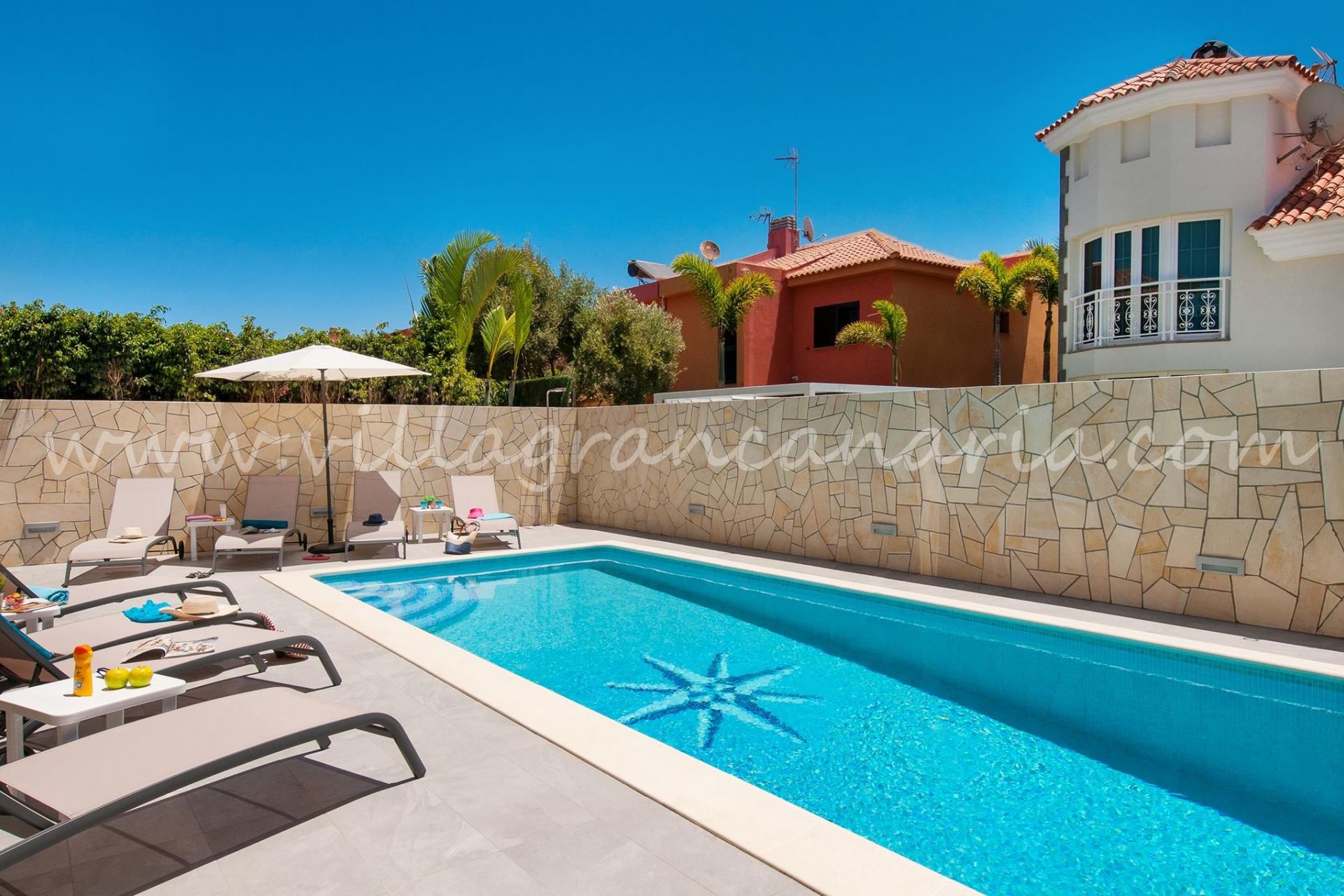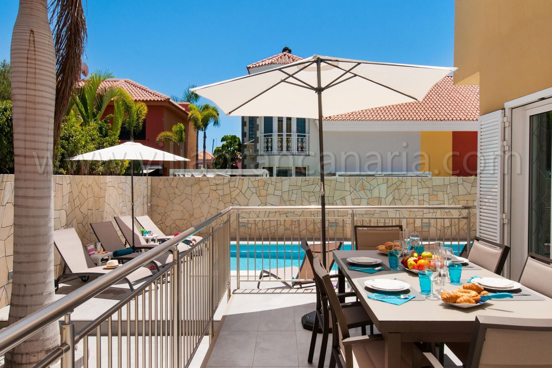 Villa Sonnenland Curie es una fantástica villa vacacional con piscina privada de 4 dormitorios con capacidad para hasta 8 personas en Sonnenland, al sur de Gran Canaria.