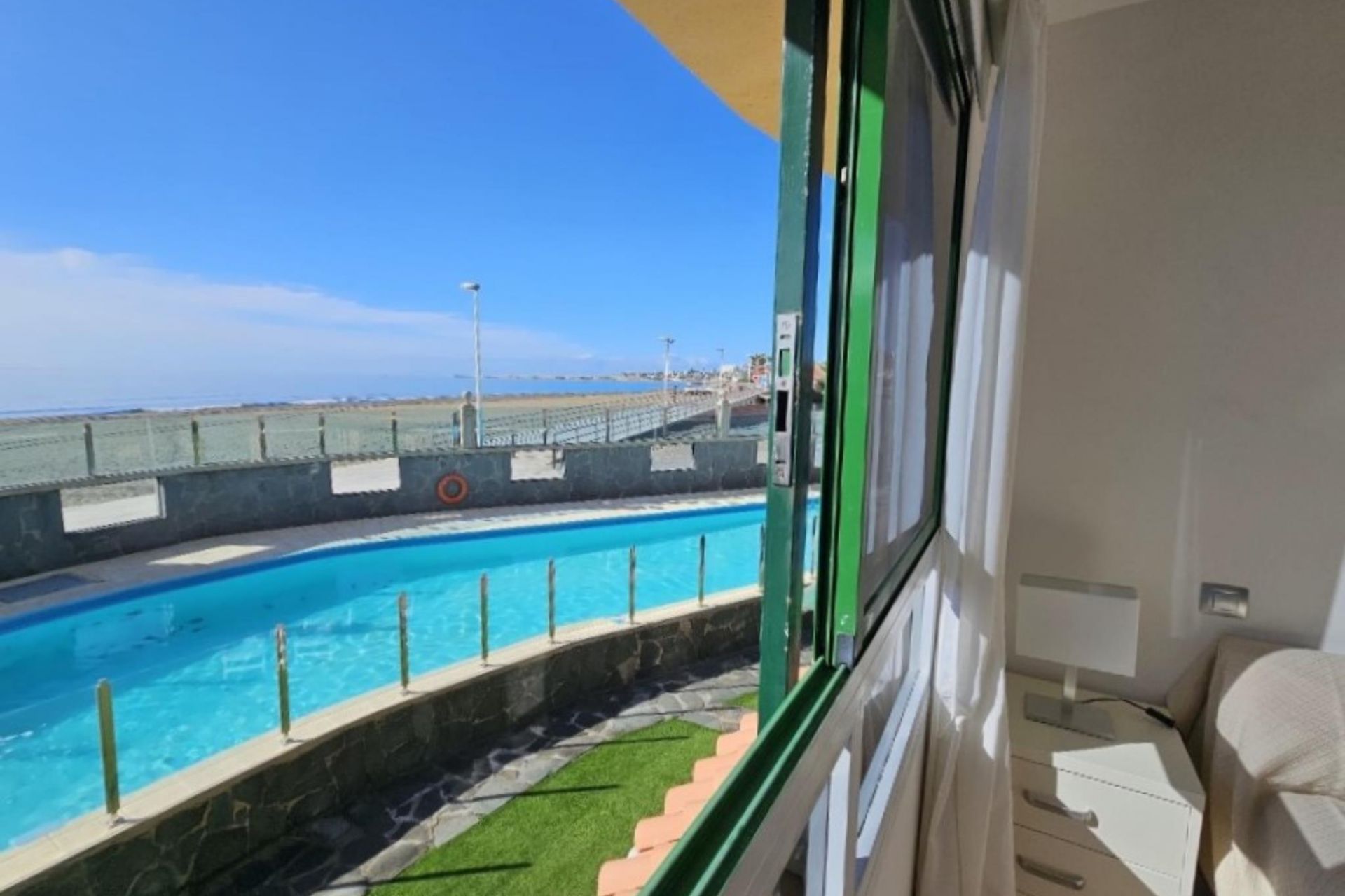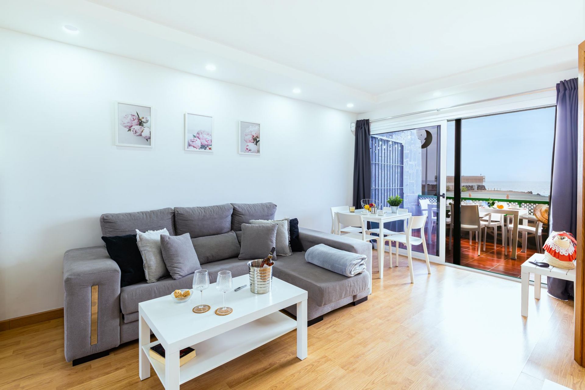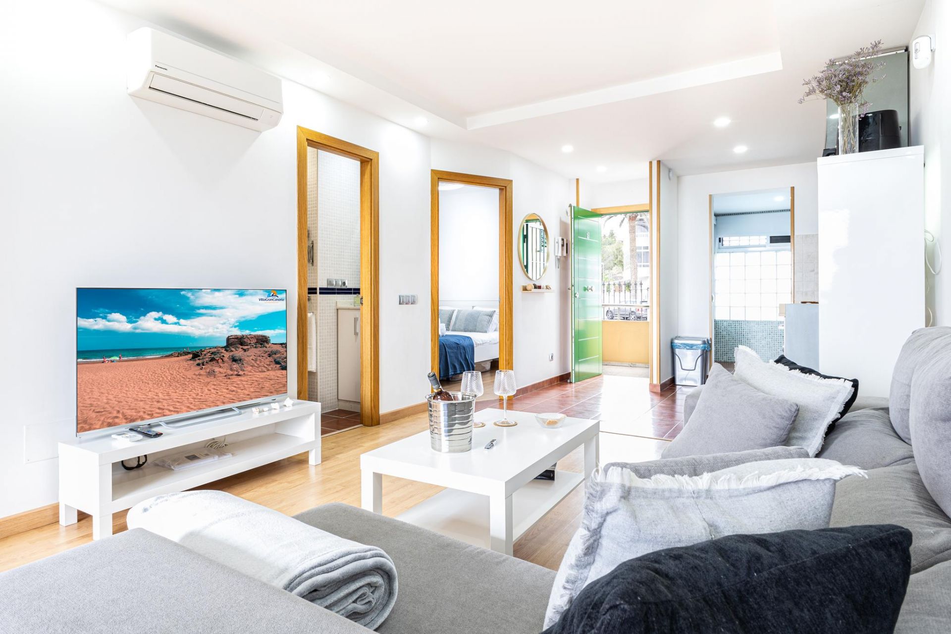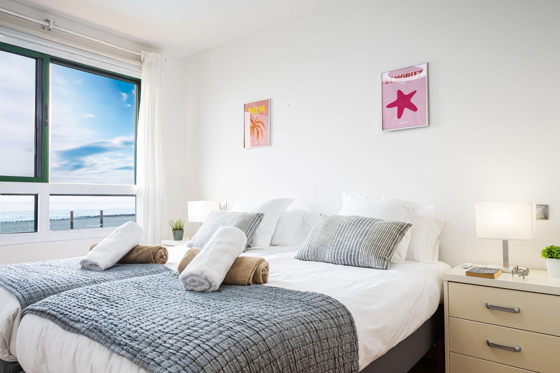 Este apartamento de alquiler frente al mar cuenta con una distribución inteligente diseñada para la comodidad, con un dormitorio que ofrece una cama doble y un segundo dormitorio con dos camas individuales, lo que lo hace ideal para familias con niños o amigos que viajan juntos.
