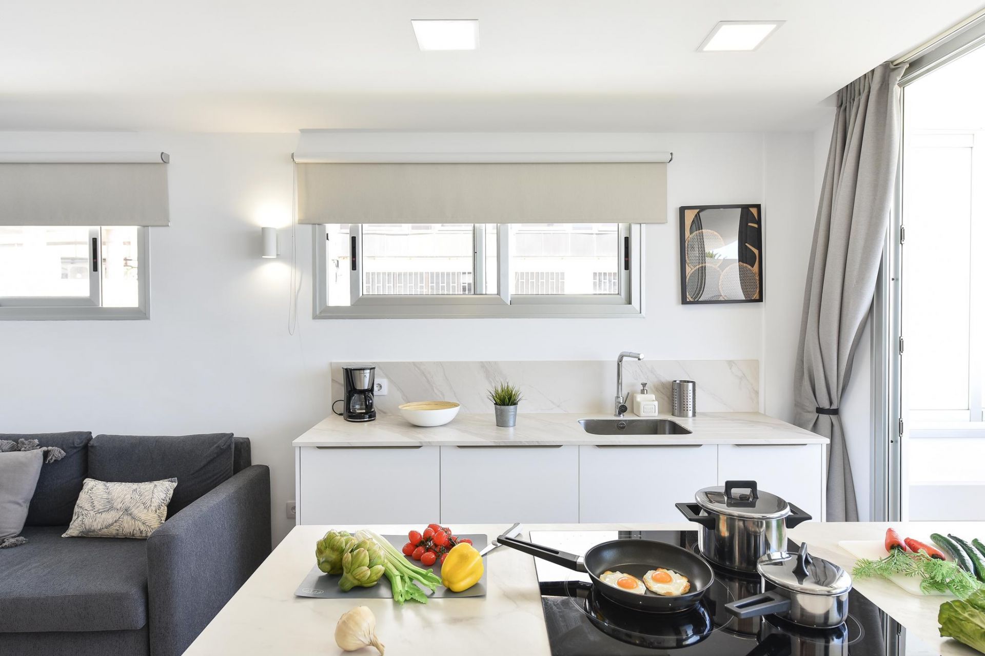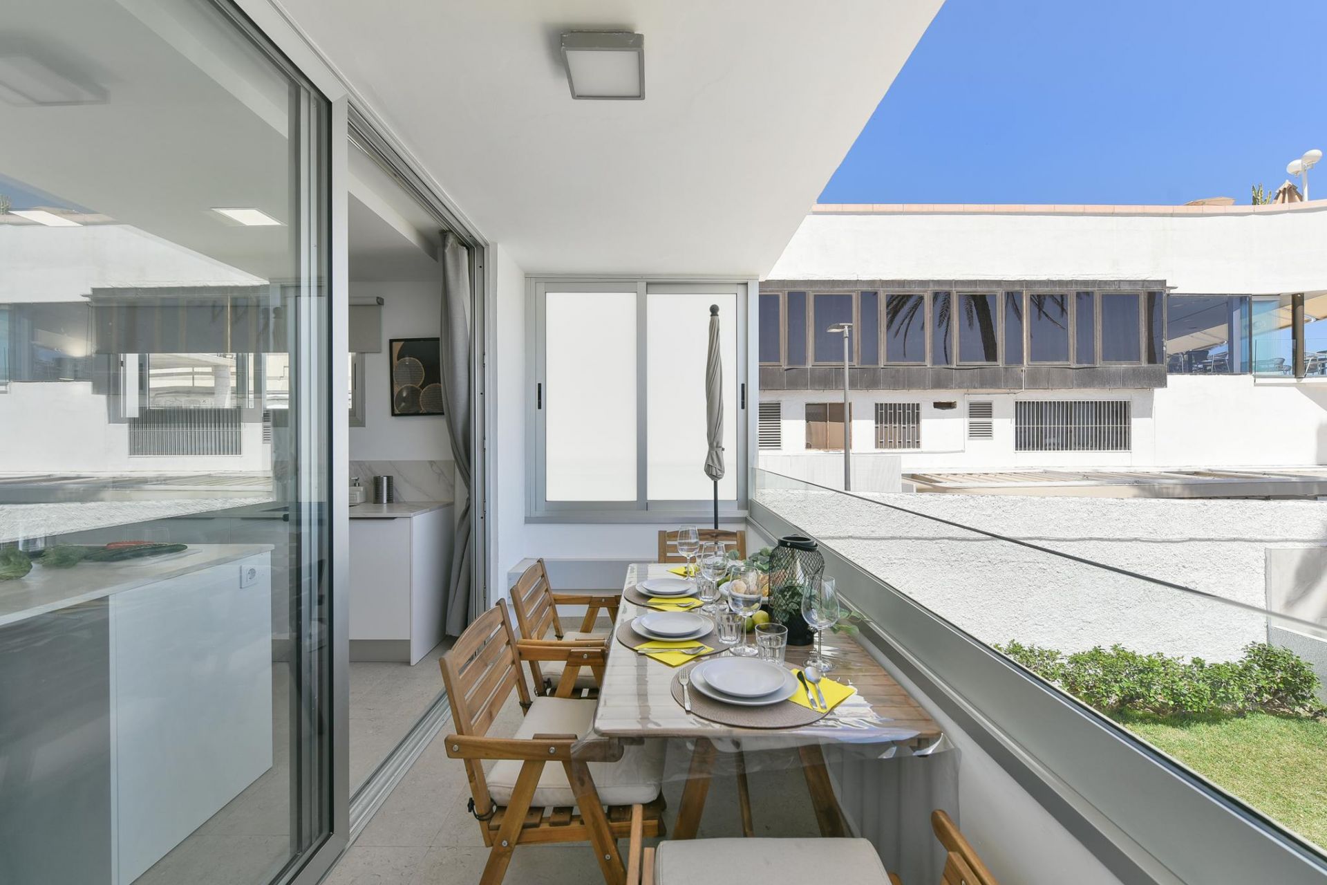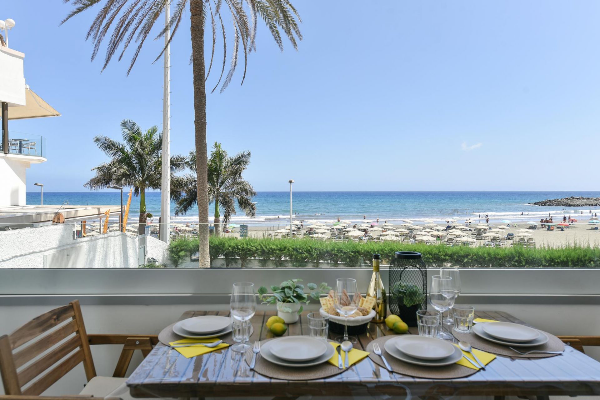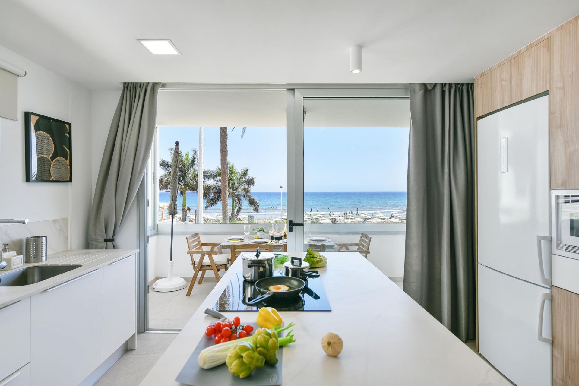 El amplio salón-cocina ofrece acceso a una maravillosa terraza con vistas al mar y a la playa de arena dorada de Las Burras, desde la que podrán disfrutar de un almuerzo o cena al aire libre con las mejores vistas.