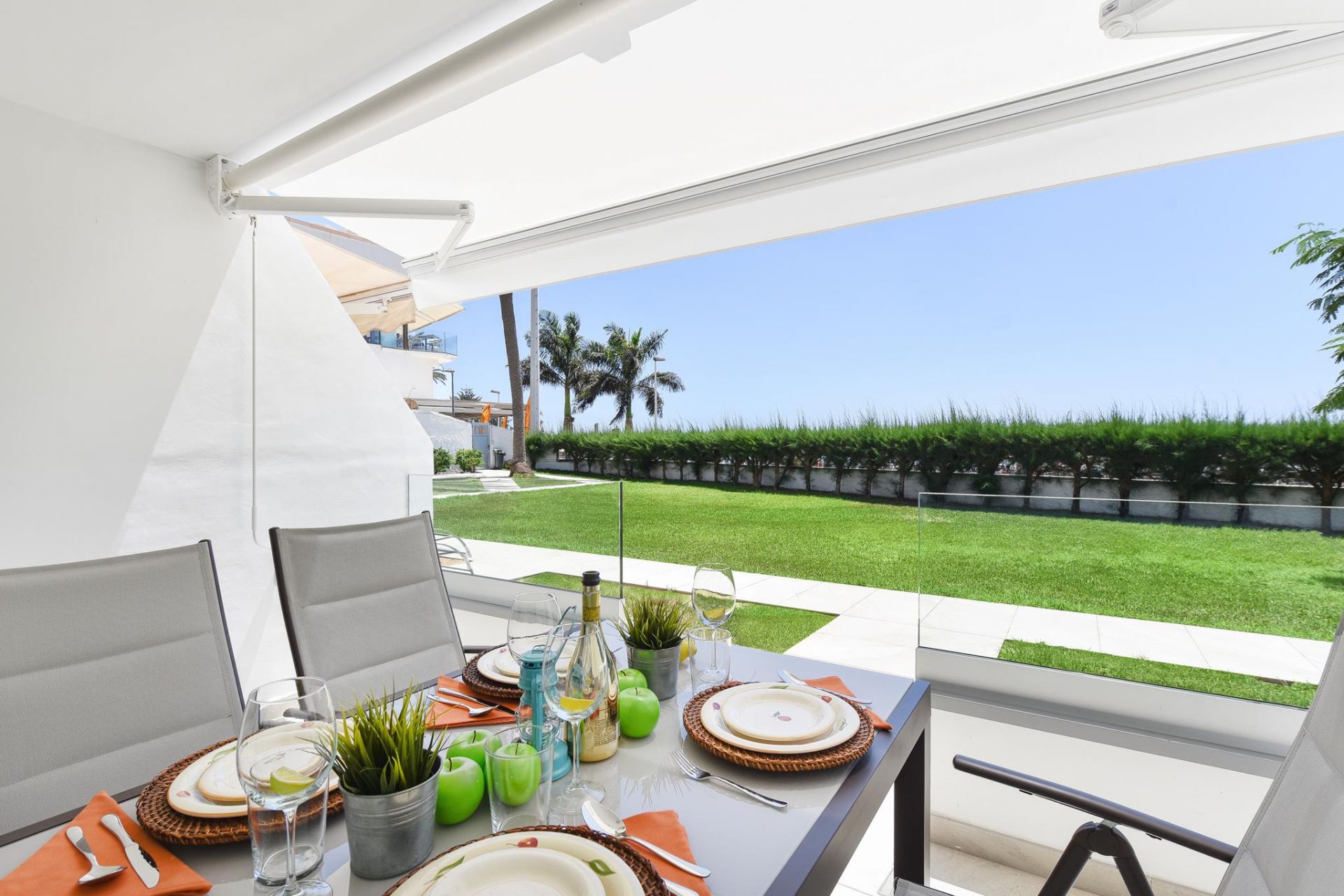 Este apartamento situado en primera línea de Playa de Las Burras goza de una privilegiada terraza que se prolonga al enorme jardín/solarium donde poder tomar cómodamente el sol estando siempre a unos pasos de nuestra casa y de la playa al mismo tiempo. Sin lugar a dudas una ventaja importante para personas que no quieran tener escaleras (movilidad reducida) o personas con niños pequeños.