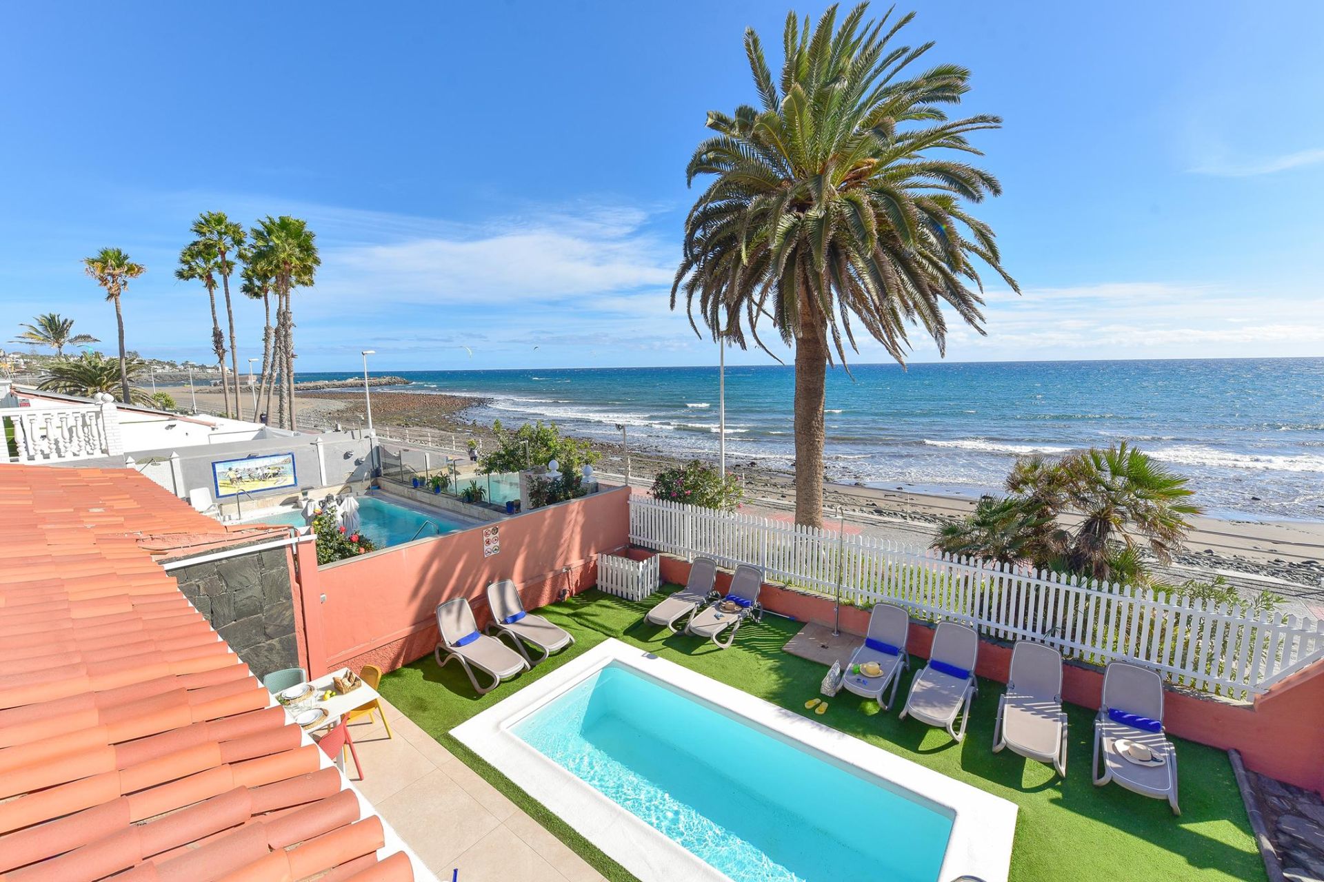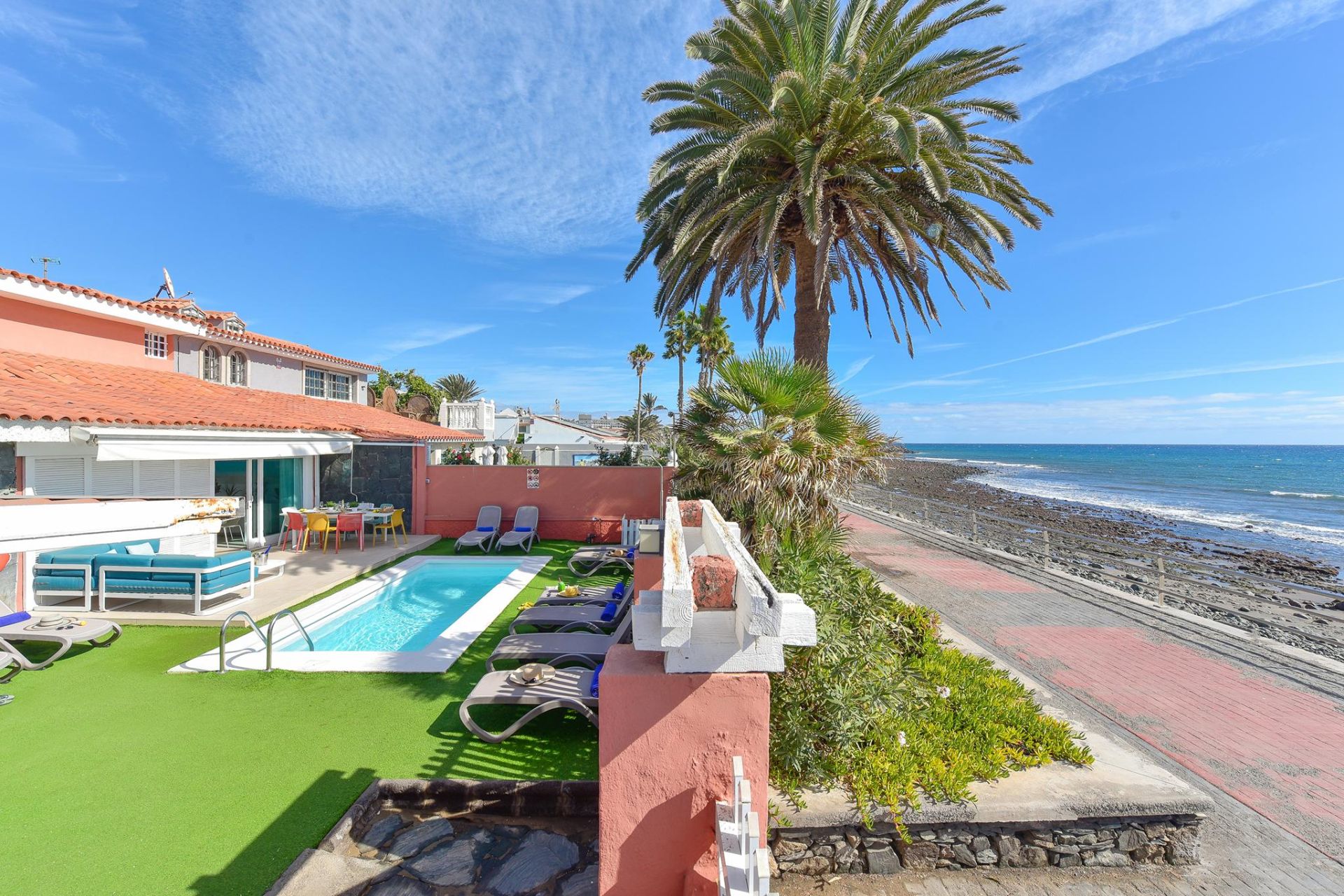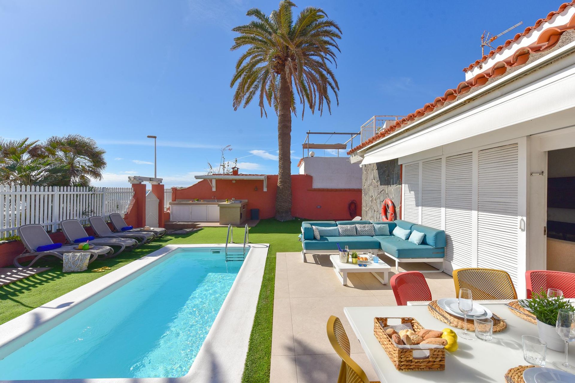 Bienvenidos a Villa El Veril, una impresionante propiedad en primera línea de playa en el sur de Gran Canaria. Con 5 dormitorios, 4 baños, una piscina privada climatizable (con suplemento) y acceso directo al paseo marítimo y a la playa, esta exclusiva villa ofrece alojamiento para hasta 10 huéspedes con total comodidad y estilo.
