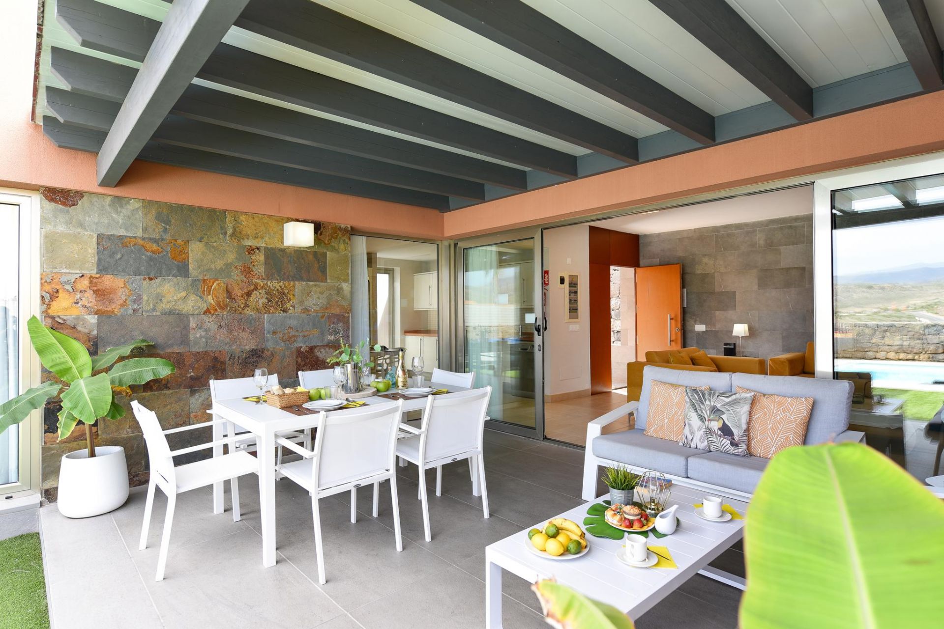 Amplia terraza semi cubierta con zona de comedor exterior y espacio de relax