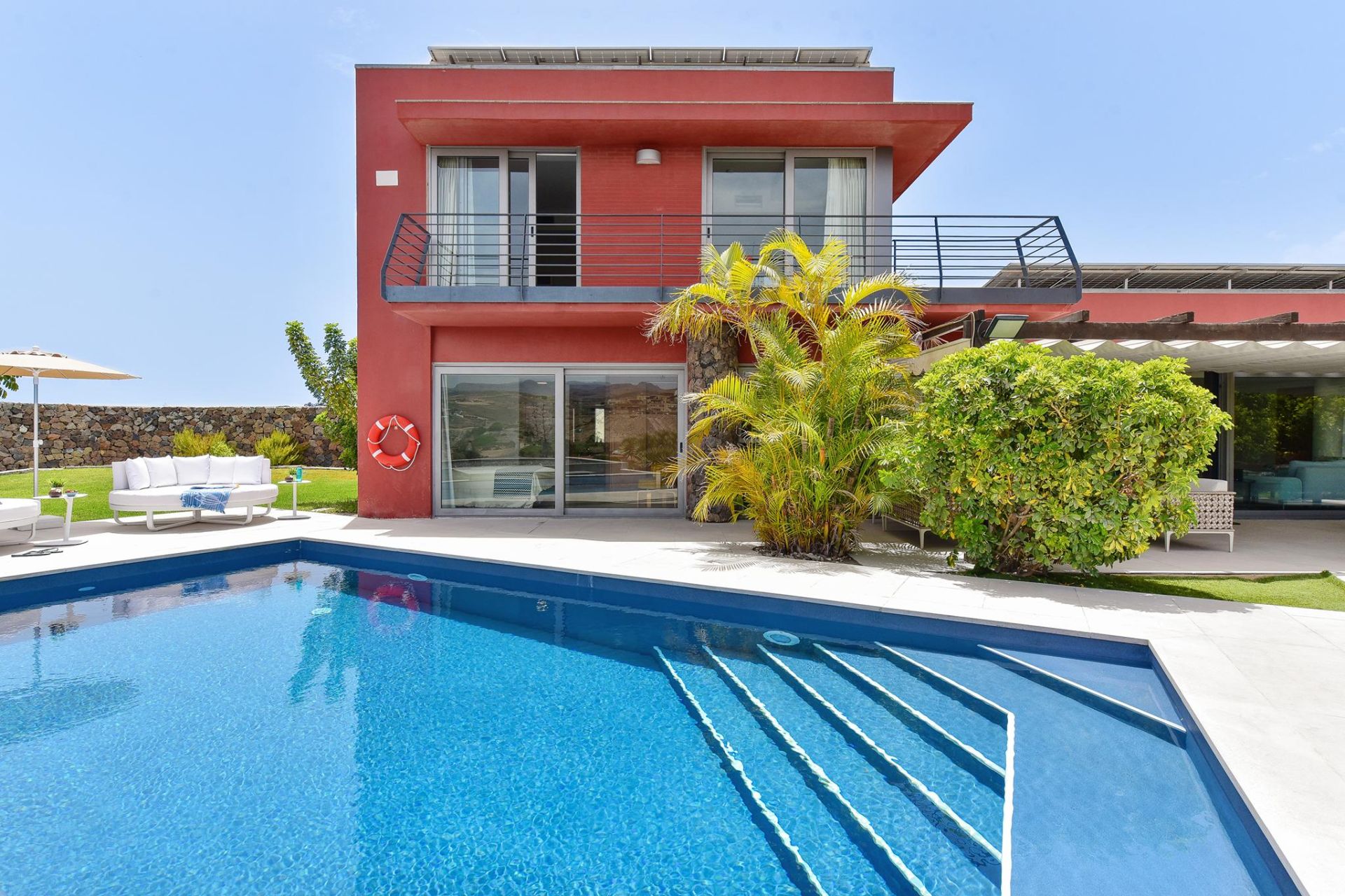 Perfecta para familias o grupos que buscan un refugio tranquilo, la villa se encuentra a pocos minutos en coche de las playas de Maspalomas, Meloneras y Amadores, disfrutando a su vez de un entorno seguro, silencioso y rodeado de naturaleza y campos de golf.