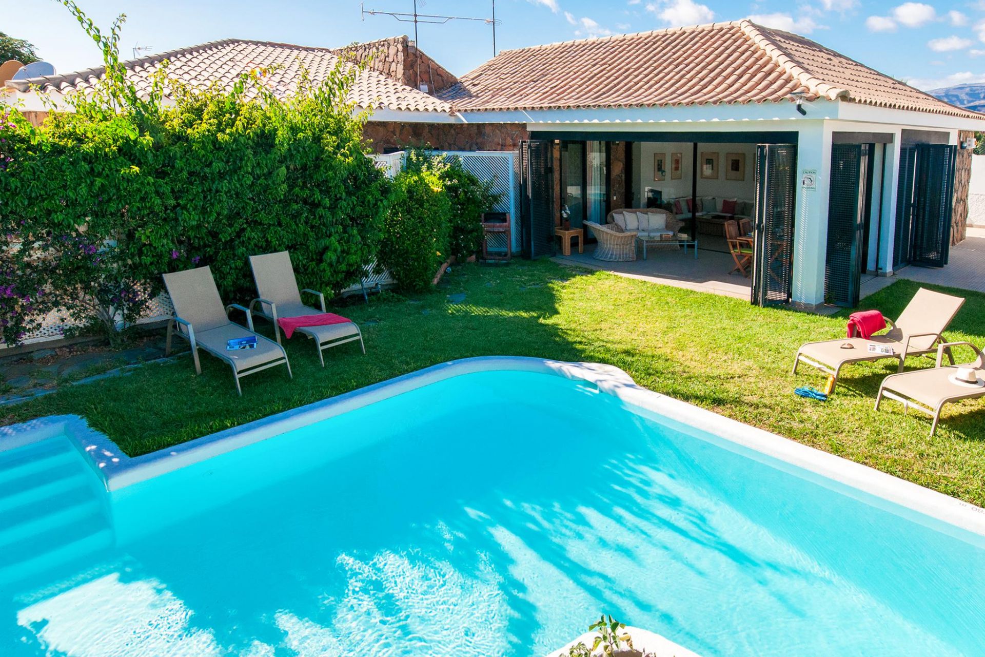 A sólo 5 minutos en coche de la Playa de Maspalomas. Esta villa con jardín y piscina privada, irradia luz natural en todo momento, y queda distribuida en amplios espacios y en una sola planta por lo que en VillaGranCanaria la recomendamos para familias con niños o personas que prefieren evitar las escaleras o con movilidad reducida.