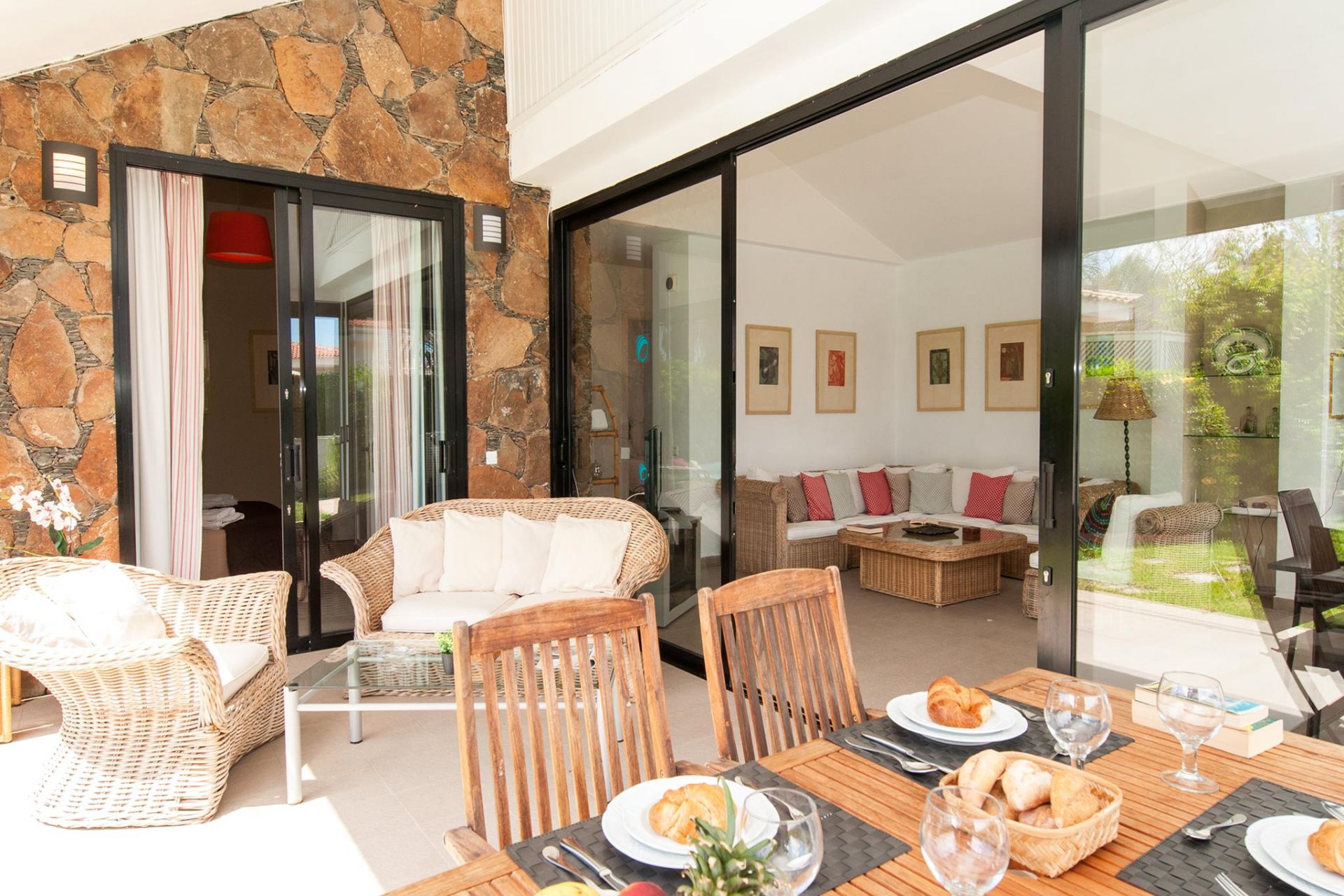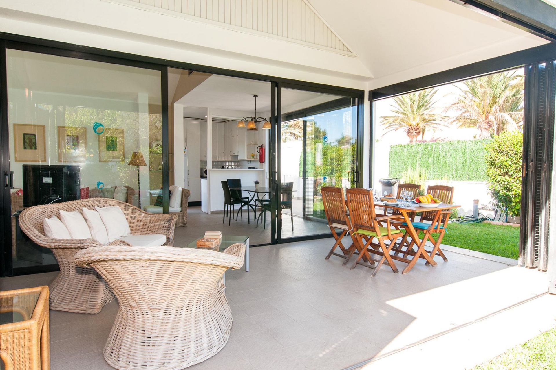 Dispone de una cocina totalmente equipada con todos los electrodomésticos y utensilios necesarios para su estancia como lavavajillas, horno, microondas, lavadora... etc. La cocina converge con un salón comedor, muy amplio y luminoso por donde se accede a la terraza y jardín privado, donde podremos encontrar barbacoa, y tumbonas para tomar el sol junto a su piscina privada.