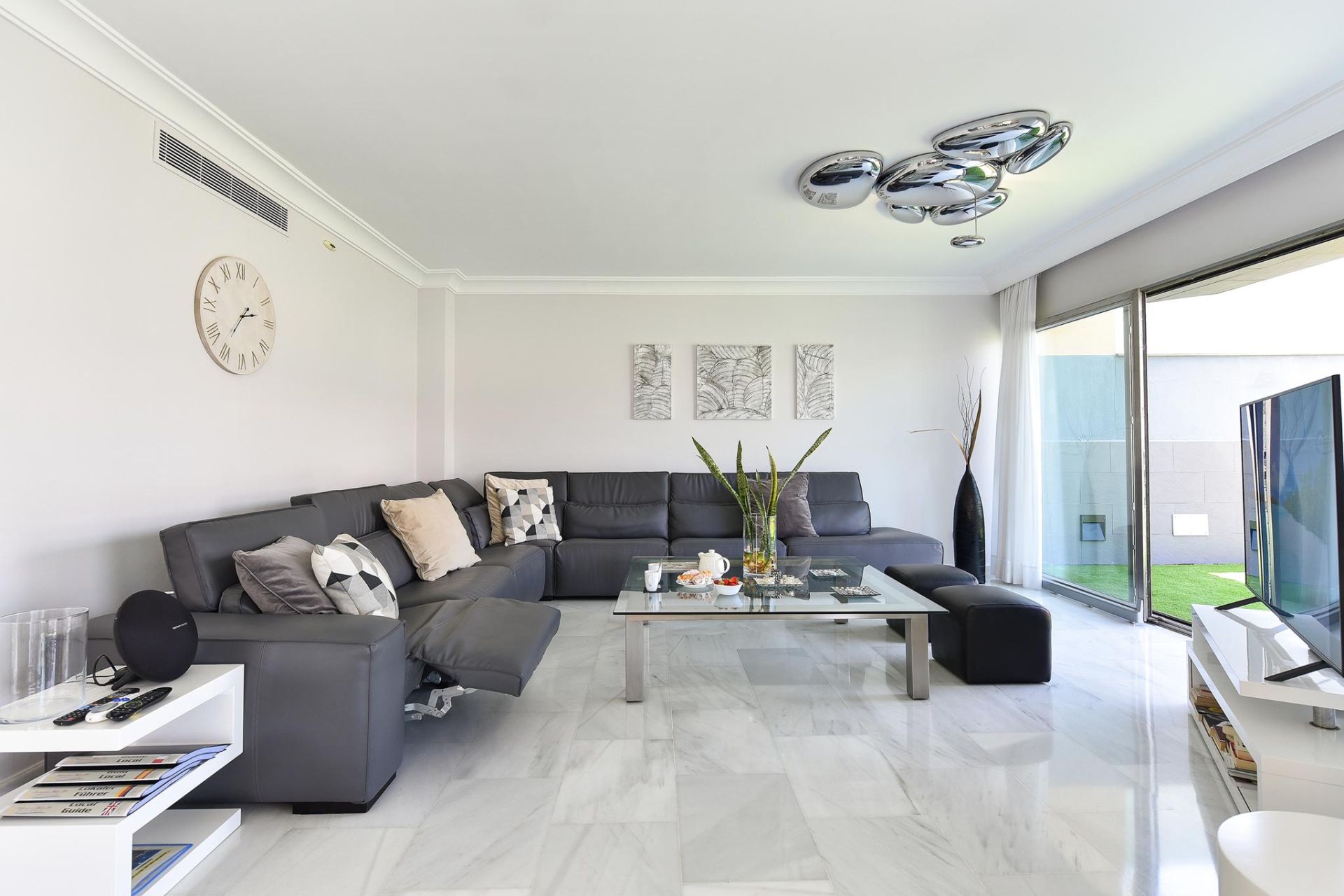 El amplio salón es muy luminoso, cuenta con Smart TV, y acceso directo a la terraza ajardinada y tumbonas para tomar el sol, que además está equipada con barbacoa de gas, zona de comedor al aire libre y ducha exterior junto a la piscina privada que es climatizable (con suplemento). Es de considerar que el cuarto y amplio dormitorio (con cama de matrimonio) con baño se encuentra situado en el sótano y no dispone de ventanas.