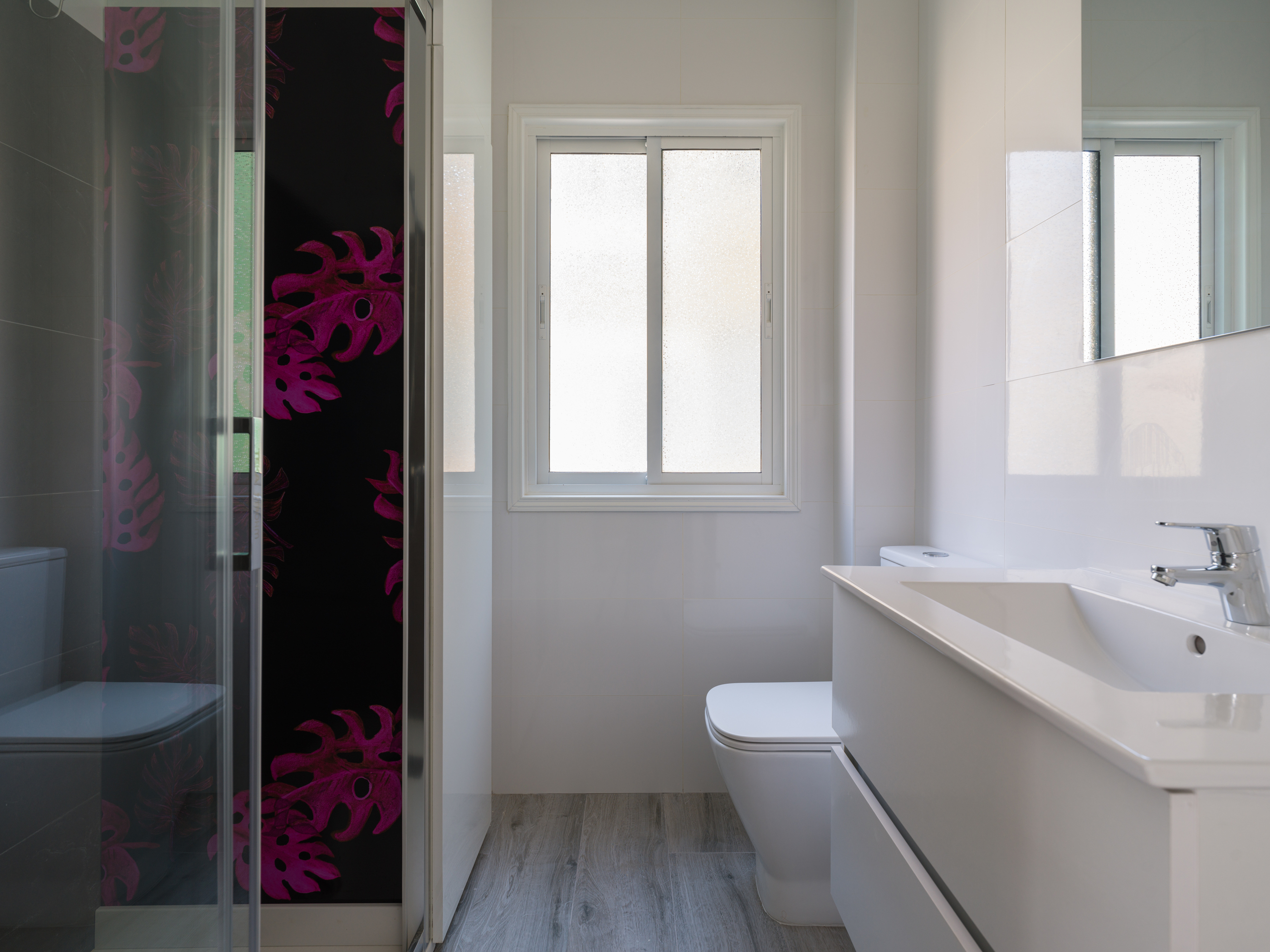 Para acceder al baño hay un pequeño peldaño de cinco centímetros, la puerta es corredera para maximizar el espacio, tiene una gran ventana, por lo que es muy luminoso, como toda la casa, plato de ducha con mampara, un armario para guardar los utensilios de limpieza, WC con doble descarga y lavamanos con espacio para almacenaje.
