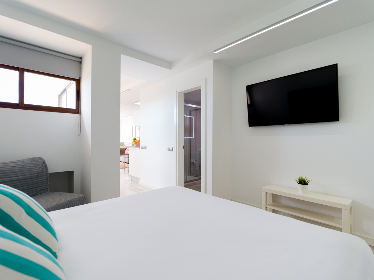 Das Schlafzimmer verfügt über ein 1,5 Meter breites Doppelbett mit einer Kommode zur Aufbewahrung von z.B. Koffern und einem weiteren Smart-TV vor dem Bett.