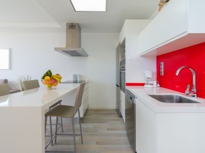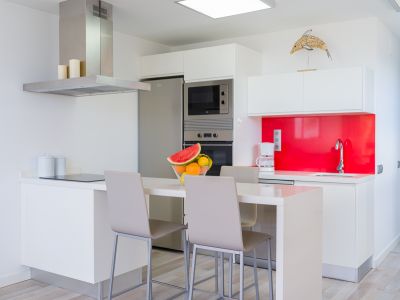 Die Küche im amerikanischen Stil ist komplett mit hochwertigen Geräten ausgestattet und verfügt über eine Kochinsel, auf der man kochen kann, während man die Aussicht genießt, sowie über ein Cerankochfeld, einen Kühlschrank, eine Mikrowelle, einen Backofen, einen Gefrierschrank, eine Waschmaschine, einen Wäschetrockner, Geschirr, Besteck, Kochutensilien, eine Kaffeemaschine, einen Toaster, einen Wasserkocher und eine Saftpresse.