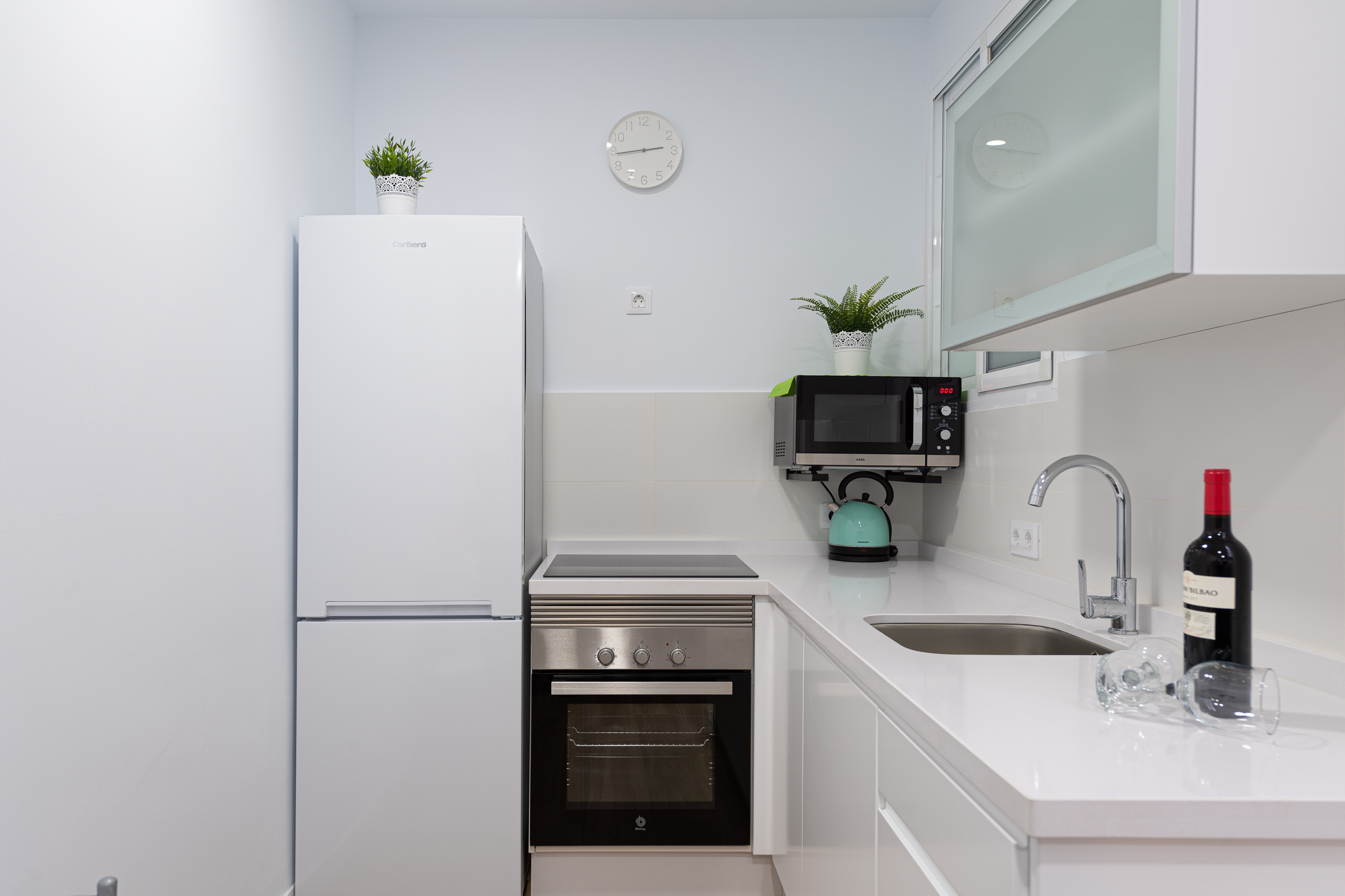 Die Küche ist komplett ausgestattet mit Induktionskochfeld, Kühlschrank, Mikrowelle, Backofen, Waschmaschine, Geschirr/Besteck, Küchenutensilien, Kaffeemaschine, Toaster, Wasserkocher und Saftpresse.