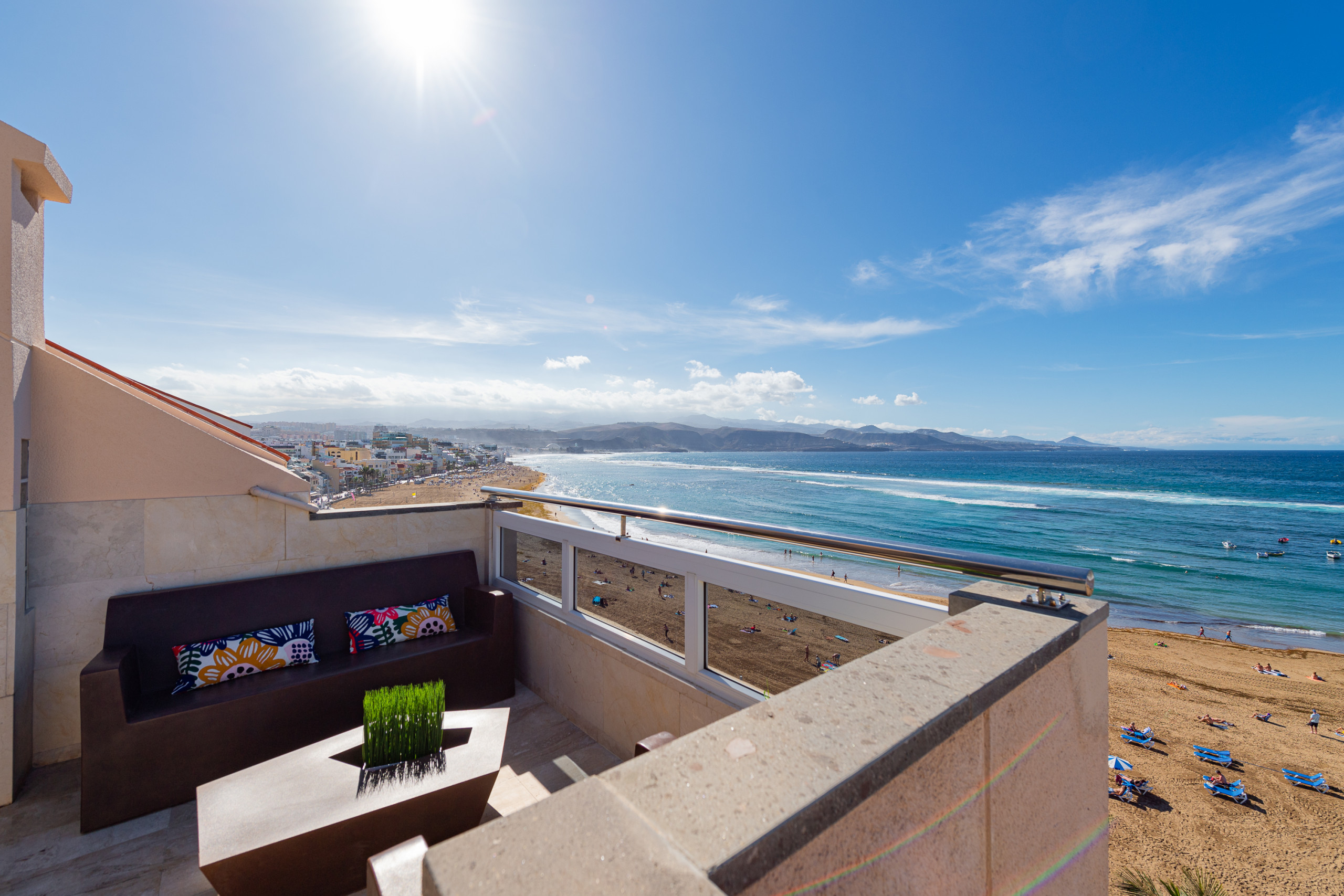 Diese wunderschöne Ferienwohnung von 179 Quadratmetern mit einer Terrasse von 15 Quadratmetern mit Blick auf den Strand von Las Canteras, in einem modernen und eleganten Stil, ist ideal für diejenigen, die einen komfortablen und erholsamen Aufenthalt in der Sonne und am Meer suchen. Es befindet sich an der Promenade von Las Canteras, einer Fußgängerzone, fünf Meter vom Strand entfernt, im obersten Stockwerk des Gebäudes.