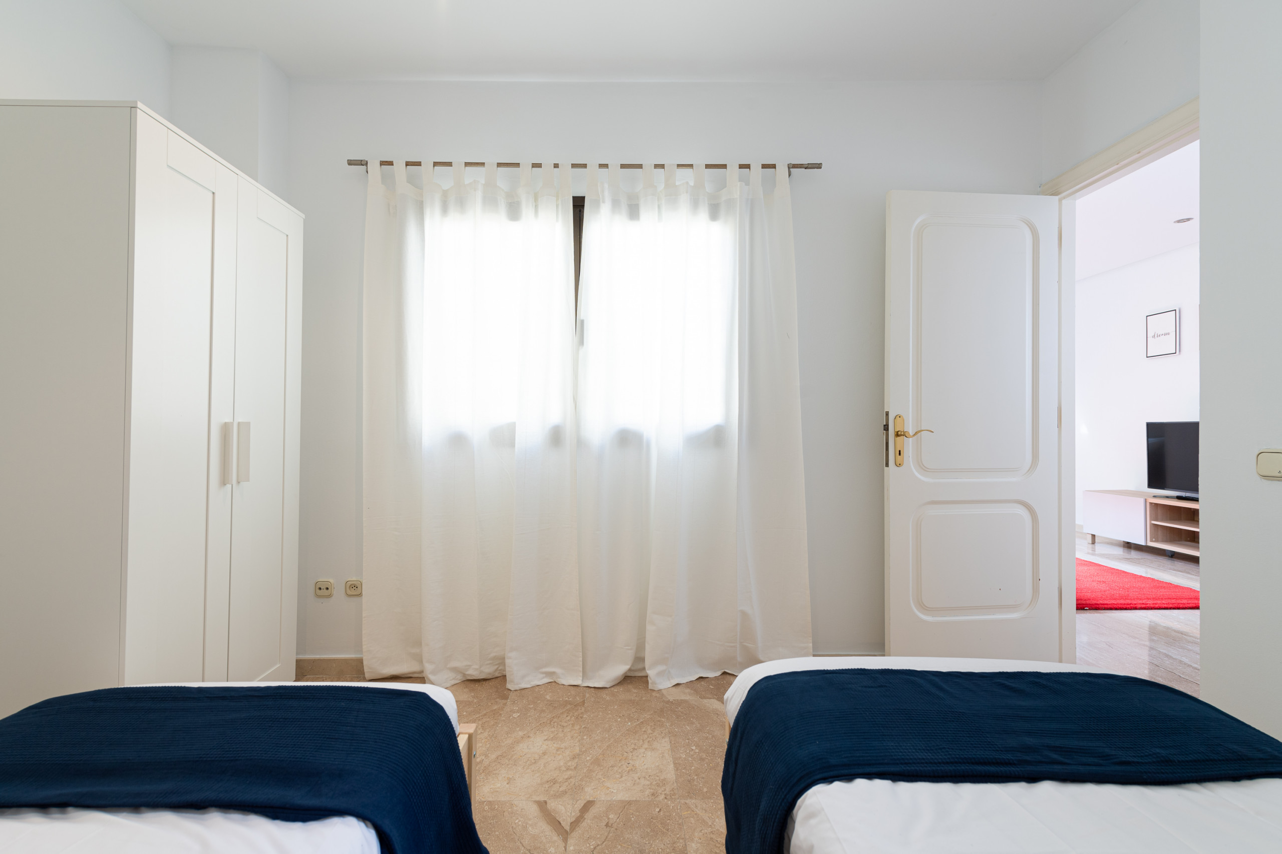 Zwischen den beiden Schlafzimmern befindet sich ein Wohnzimmer mit einem großen und bequemen Doppelschlafsofa (1,50 Meter) und Smart TV, das als drittes Schlafzimmer genutzt werden kann.