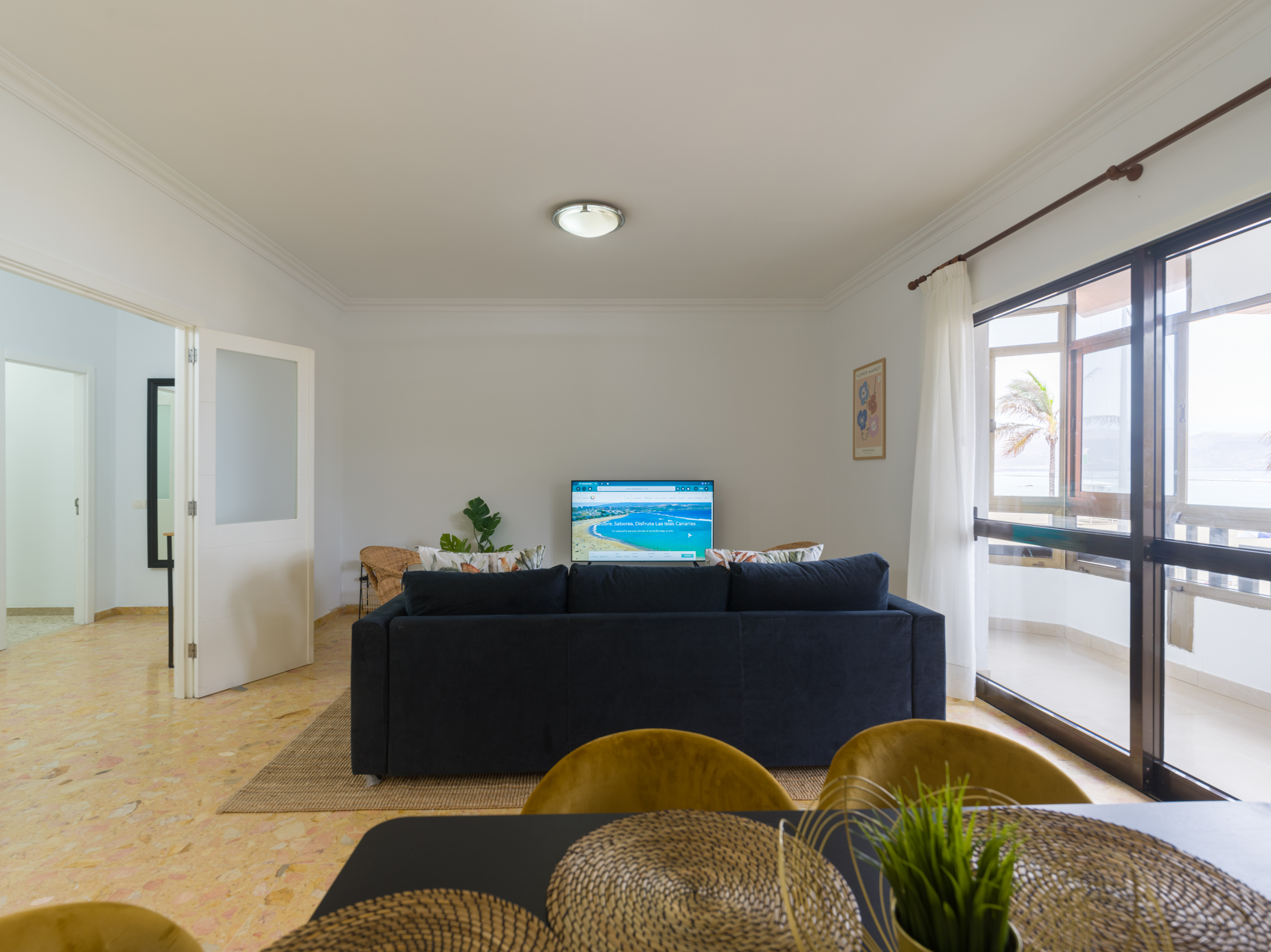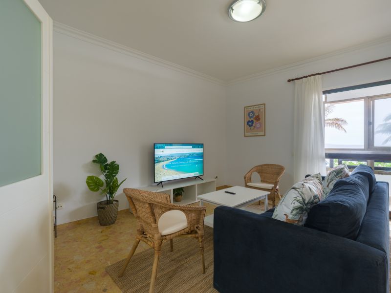 Das Wohn-Esszimmer ist zum Meer hin ausgerichtet, von wo aus Sie einen herrlichen Blick auf das Meer und den Strand sowie traumhafte Sonnenuntergänge mit der Insel Teneriffa im Hintergrund und dem majestätischen Teide (dem höchsten Berg Spaniens) genießen können. Das Wohnzimmer ist mit einem Dreisitzer-Sofa, zwei Sesseln, einem großen Esstisch, der auch für Telearbeit genutzt werden kann, und sechs bequemen Stühlen ausgestattet. High-Speed-Wi-Fi und ein Smart-TV, um in Verbindung zu bleiben und sich bei der Telearbeit von der Aussicht inspirieren zu lassen.