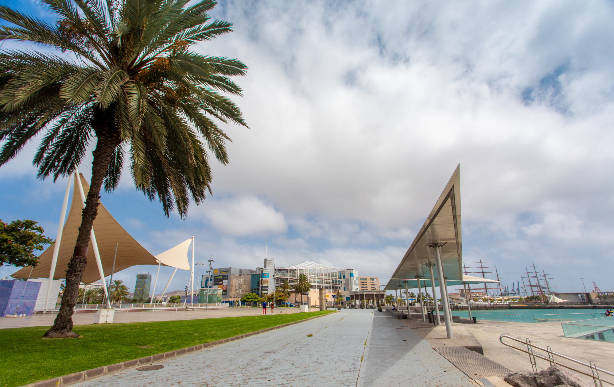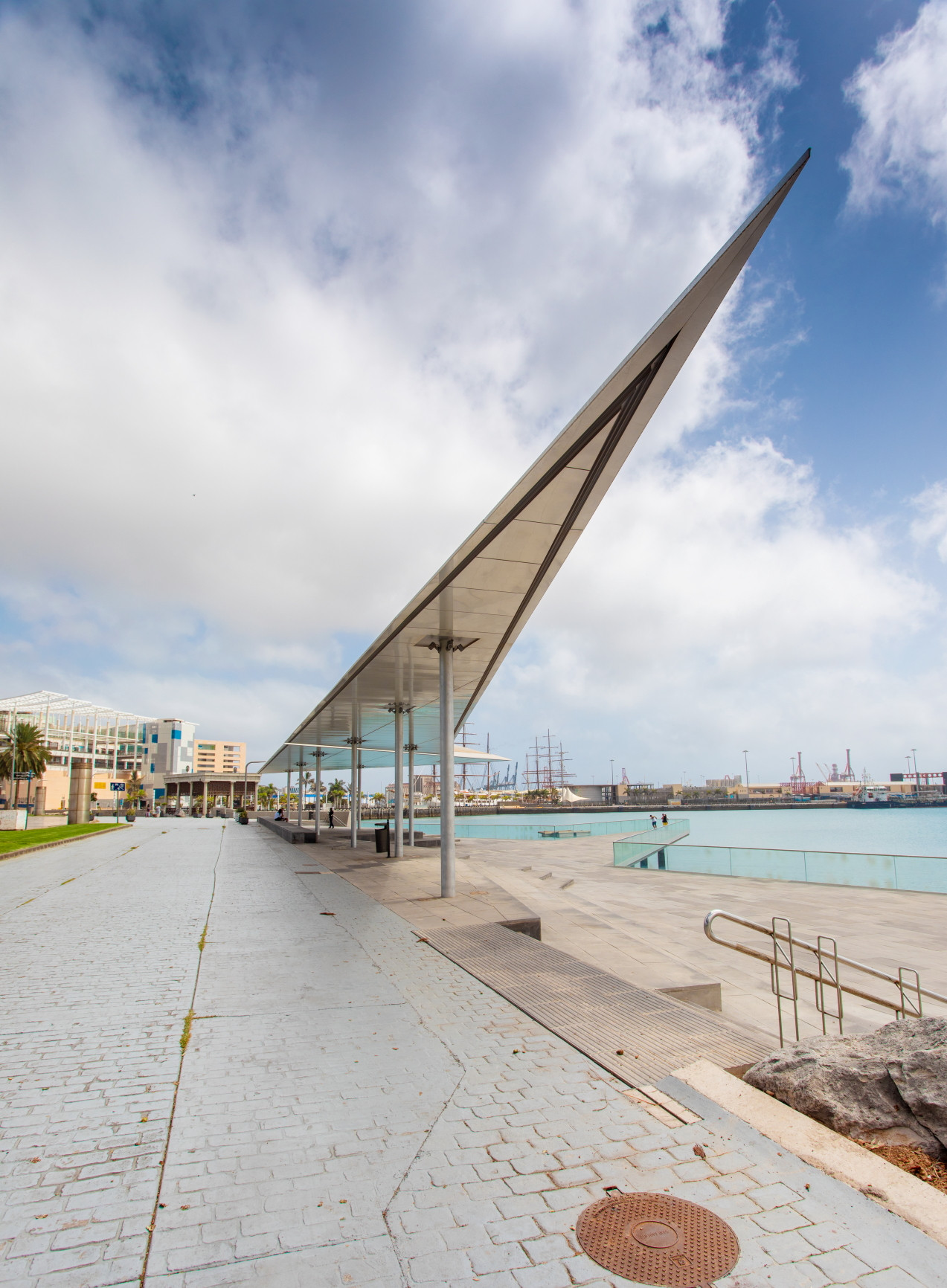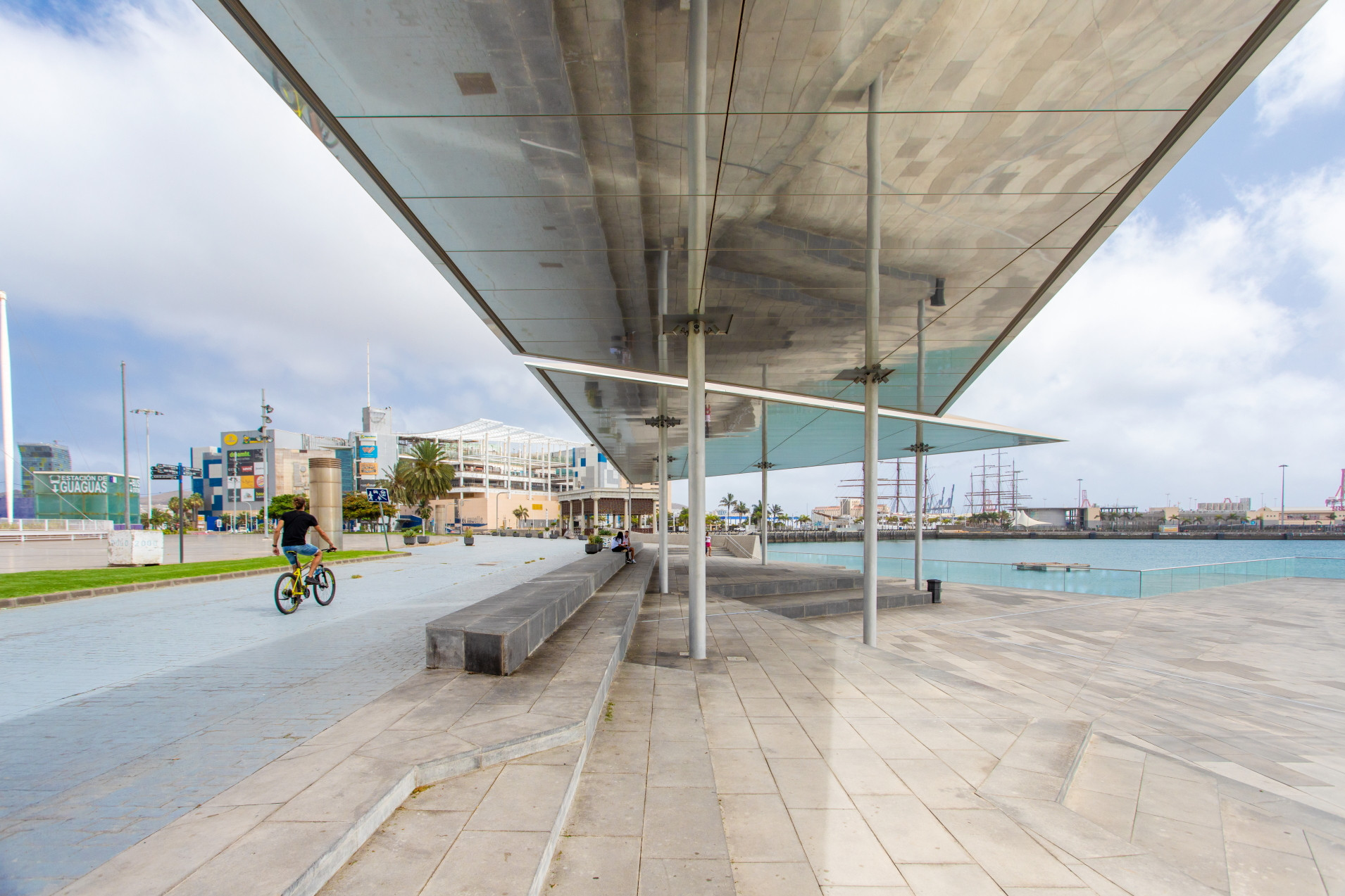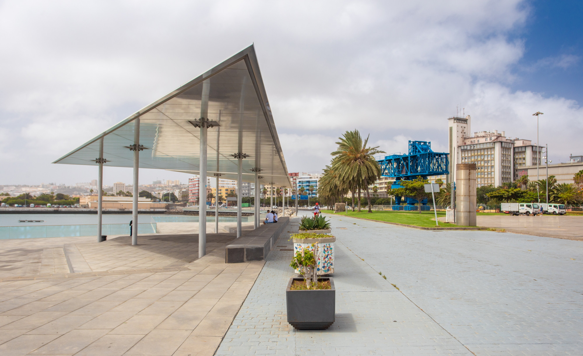 In addition, less than 100 metres away, the Parque Marítimo del muelle de Santa Catalina is an authentic viewpoint to enjoy the stay of the large tourist cruise ships in the Port of Las Palmas; a solarium or water front, which is suspended above the sea, divided into two levels with a grandstand and a ramp that connects them, in a space of 1,262 square metres. A glass railing on the sea side, as well as a fountain on the ground at the top of the esplanade, have turned this facility into a pleasant meeting place to enjoy the port landscape.