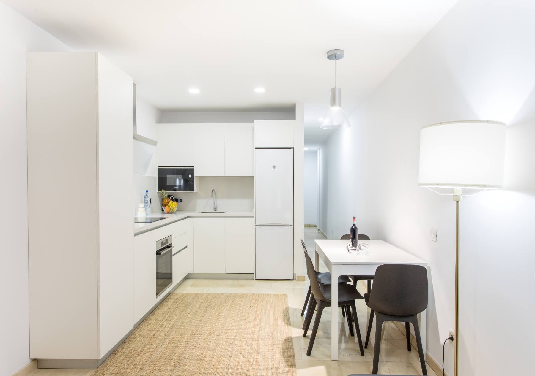 La cocina americana está totalmente equipada con nevera, congelador, microondas, cafetera y todo lo necesario para preparar tus comidas. Además, cuenta con una zona de comedor con mesa y sillas.
