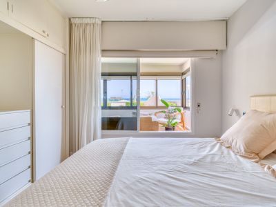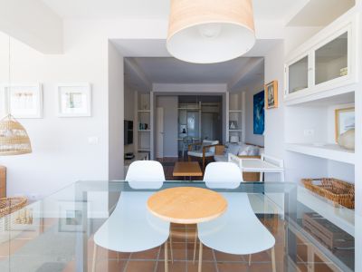 Alojamiento de 85 m², con exquisita decoración, amplio salón con grandes ventanales que dan a una tranquila piscina comunitaria y con el mar de fondo.
