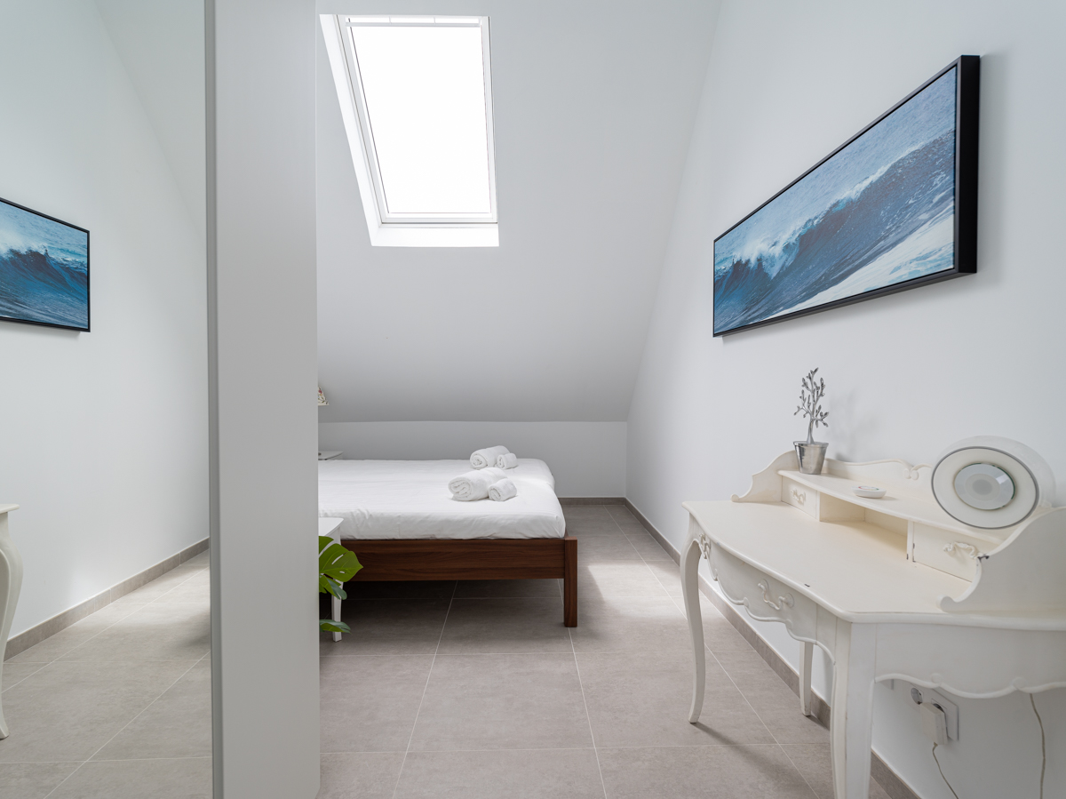 En la segunda planta, están los dos dormitorios abuhardillados, con ventiladores en los techos, con control remoto y persianas eléctricas, uno de los dormitorios tiene una cama de matrimonio grande y el segundo dispone de dos camas individuales, además de otro baño completo.